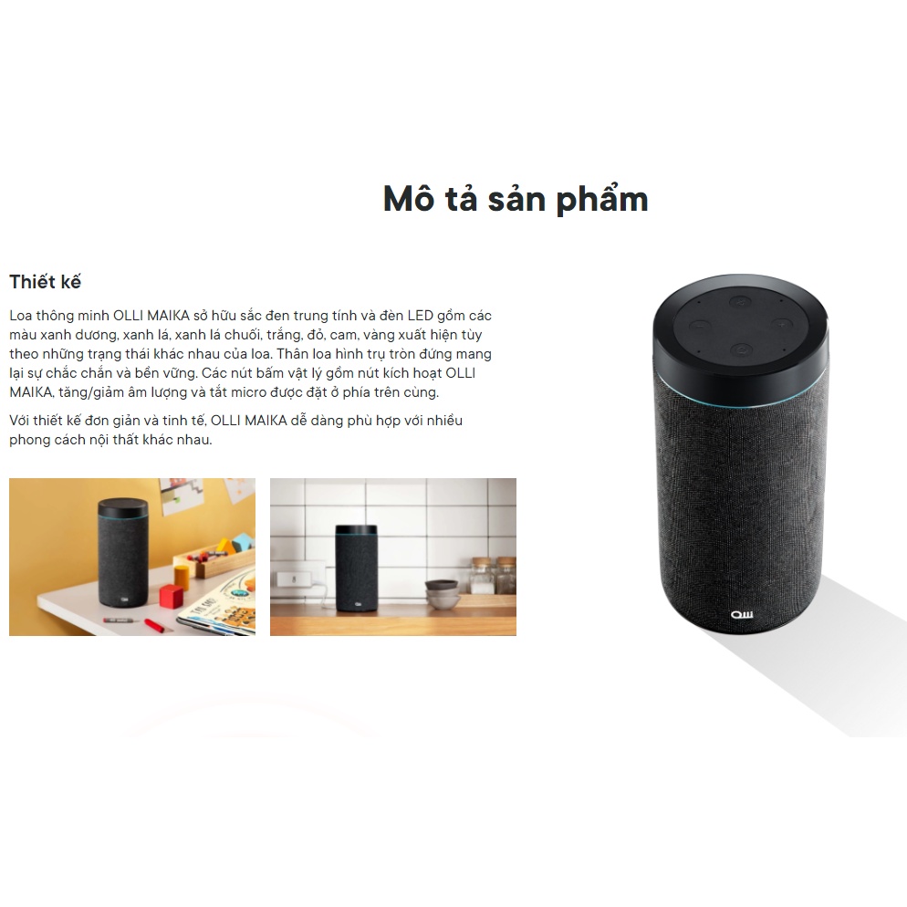 Loa Thông Minh Bluetooth Olli Maika - Loa Trợ Lý Ảo Thuần Việt , Hỗ Trợ Thiết Bị Nhà Thông Minh (Bảo Hành 2 Năm) ✅MÔ TẢ SẢN PHẨM ✅Thông số kỹ thuật ✅Thương hiệu: OLLI Technology JSC. (Việt Nam) ✅Kích thước: Kích thước: 96 x 96 x 191.5mm. ✅Màu sắc: Màu đen. ✅Chống nước: Không ✅Kết nối dữ liệu: Wi-Fi 802.11a/b/g/n/ac (2.4 GHz/5 GHz) Bluetooth® 5.0 ✅Bộ xử lý: Bộ xử lý Dual-core Cortex A53 1.0 GHz. ✅Phụ kiện đi kèm: Adapter; Hướng dẫn sử dụng ✅Bộ nguồn: Đầu vào: 100-240VAC,50/60Hz; Đầu ra: 12VDC-2A; Chiều dài cáp: 1.5m. ✅Loa và micro: Loa toàn dải 4Ω 15W, 2 x màng rung thụ động và 4 micro đa hướng. ✅Thiết bị tương thích ✅Hiện tại, OLLI MAIKA hỗ trợ điều khiển nhà thông minh của nhà sản xuất HUNONIC, Điện Quang, Tuya Smart, Smart Life, Goman Smart, HOMEGY và ACIS. Trong thời gian tới, OLLI MAIKA sẽ mở rộng tích hợp với các đơn vị nhà thông minh khác để đem đến đa dạng sự lựa chọn cho người dùng. ✅Tính năng nổi bật ✅Những tính năng nổi bật của OLLI MAIKA: Nghe nhạc, Gọi điện thoại, Nhắc công việc, Điểm tin, Nghe đài, Kể chuyện, và Điều khiển nhà thông minh. Về mặt âm thanh tích hợp 4 micro đa hướng với tính năng lọc ồn người dùng có thể ra lệnh bằng giọng nói từ xa dễ dàng. ✅Sản phẩm còn trang bị 2 loa đa hướng có công suất 15W cho chất lượng âm cao và tái tạo chi tiết từng âm thanh. Bạn có thể kết nối loa với điện thoại thông qua ứng dụng Maika bằng cách quét mã QR dưới đế loa. #Loa thông minh # loa thông minh olli maika #loa thong minh #Loa thông minh maika #loa thong minh maika #maika #olli maika #trợ lý ảo tiếng việt #Loamaika