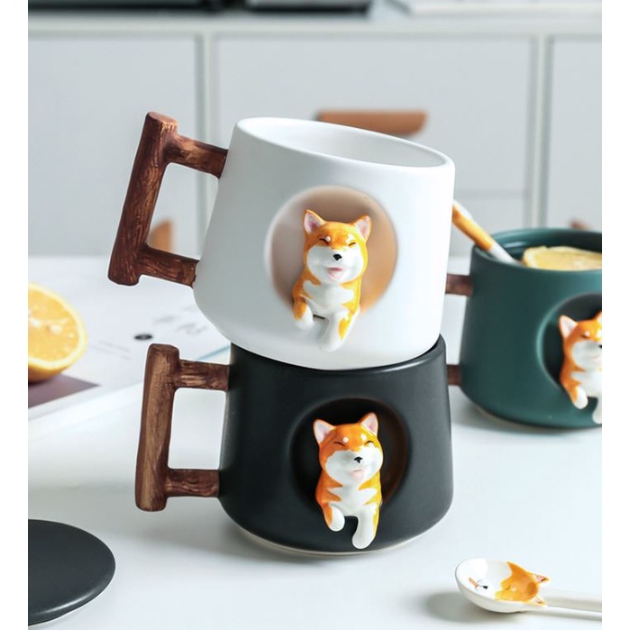 Ly Cốc Sứ Chú Chó Shiba Inu Hóng Hớt Quai Giả Gỗ Kèm Muỗng Thìa BN027