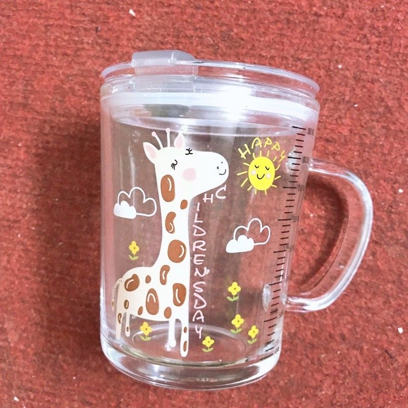 Ly thủy tinh cao cấp chia vạch hoạt hình có quai , nắp chống tràn + tặng kèm ống hút dùng uống sữa , nước trái cây