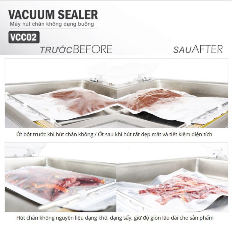 ✅ Máy hút chân không thực phẩm VCC02 là loại máy hút chân không kiểu buồng tốt nhất với khả năng hút chân không đa dạng các loại nguyên liệu khác nhau. 💯💯💯Dòng máy này nổi bật với tính năng hút chân không các sản phẩm dạng bột, các loại nước sốt hay chất lỏng, giúp đó