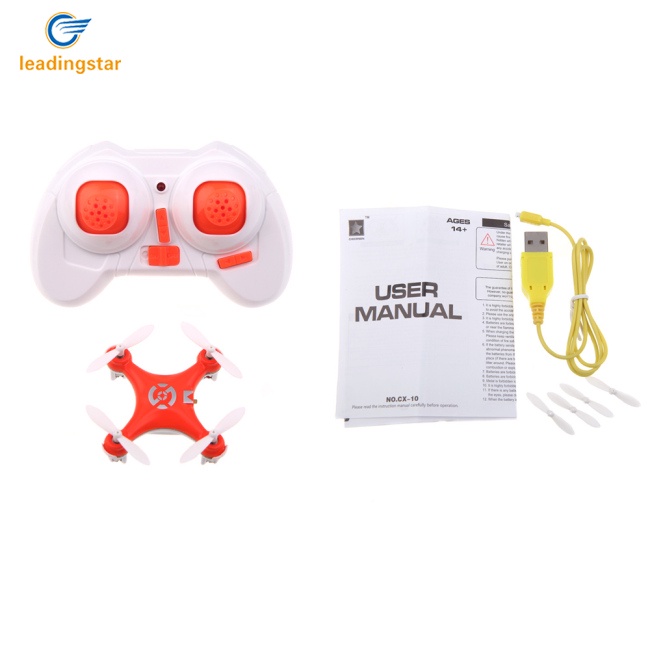--4 Kênh bánh quadcopter mini lăn, Ném bay, con quay hồi chuyển 6 trục thật. - Lên / xuống / trái / phải / bay bên / di chuyển / kẹp / thả tay, chế độ 3 tốc độ bay. --4 Màu có sẵn, Báo động điện áp thấp. - Có đèn LED cho chuyến bay đêm. Mô tả: Tên khoản mục: Cheerson CX-10 Mini RC Quadcopter Tần số: 2.4G Con quay hồi chuyển: 6 trục Chất liệu: ABS Kích thước: 40x40 x 22mm Màu: hồng, xanh lá, xanh dương, cam Thời gian bay: khoảng 5-8 phút Thời gian sạc: 30 phút Khoảng cách điều khiển: khoảng 20-50M Pin cho quadcopter: 3.7V 100mah Pin để phát: 2 x pin AAA (không bao gồm) Màu: hồng, cam, xanh lá, xanh dương Giấy chứng nhận: EN71, EN62115, ROSH, HR4040, ASTM, RTTE, CE. Gói hàng bao gồm: 1 x Cheerson CX-10 Mini RC Quadcopter 1 x máy phát 2.4G 1 x Cáp sạc USB 2 x lưỡi phụ Lưu ý: Do đo lường thủ công, nó có thể thay đổi từ 1 cm đến 3 cm. Độ lệch màu sắc có thể khác nhau do cài đặt màn hình khác nhau, vui lòng thông cảm. #Đồ chơi sinh nhật trẻ em#Bếp hồng#Màu vàng dẫn#Halloween mini#Sinh nhật xanh#Đứa trẻ nhỏ#Không có 10#Lát cx 10#Sinh nhật trẻ em#Màu xanh lam mini
