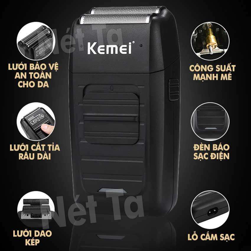 Máy cạo râu khô 2 lưỡi có thể fade trắng chân tóc Kemei KM-1102 công suất mạnh mẽ, pin sử dụng liên tục 45 phút Bộ sản phẩm máy cạo khô KEMEI 1102 sẽ giúp bạn cạo râu, cạo trắng chấn FADE 1 cách dễ dàng. Sản phẩm phù hợp cho các tiệm tóc, salon cắt tóc. barber shop chuyên nghiệp.Mô tả sản phẩm Sản phẩm sử dụng pin sạc sạc đầy trong 8 tiếng, bạn có thể sử dụng từ 1h-2h đồng hồ Máy cạo khô KEMEI 1102 shaver sử dụng điện sạc vào máy từ 110-240v Máy cạo râu,FADE tóc rất tốt Thiết kế linh hoạt , dễ dàng xoay theo góc cạnh khuân mặt , cổ , gáy Công suất: 3w Sản phẩm dùngđể cạo tóc rất tốt Tốc độ lưỡi cắt lên đến 10.000RPM