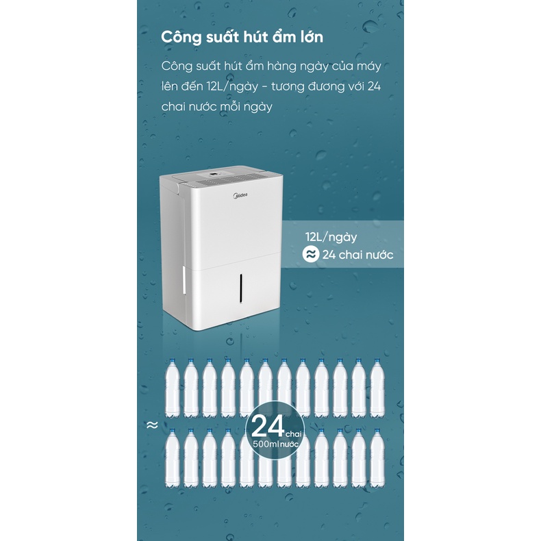 Thương hiệu: Midea Model: CF12BD/N7-DN Điện áp định mức: 220V-50Hz Công suất định mức: 230W Công suất tối đa: 350W Độ hút ẩm định mức: 12L/ngày (30oC / RH 80%) Tiếng ồn: 46dB(A) Dòng điện: 1.3A Dòng điện tối đa: 2A
