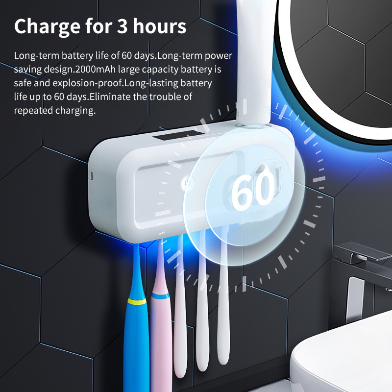 Thời gian giao hàng dự kiến cho sản phẩm này là từ 7-9 ngày ✨Gói hàng bao gồm: 1 * Máy tiệt trùng bàn chải đánh răng 1 * Nhãn dán không để lại cặn 1 * Cáp USB 1 * Hướng dẫn sử dụng ✨ Thông tin sản phẩm Đặc trưng: Dễ dàng để cài đặt Được trang bị một miếng dán không để lại vệt, chỉ cần dán lên tường, sau đó treo giá đựng bàn chải đánh răng, thuận tiện khi lắp đặt. Khử trùng bằng tia cực tím Tích hợp đèn cực tím, tỷ lệ tiệt trùng cao tới 99,99 phần trăm, chế độ tiệt trùng có thể được kích hoạt bằng cách nhấn nút, và đầu bàn chải có thể được làm sạch 360 độ. Hai phương pháp sạc Đi kèm với bảng điều khiển năng lượng mặt trời diện tích lớn, kéo dài thời gian chờ một cách hiệu quả và máy tiệt trùng bàn chải đánh răng có thể được sạc qua cáp USB. Bóp kem đánh răng tự động Phù hợp với các loại kem đánh răng có kích thước lớn và nhỏ, kem đánh răng có thể được ép ra chỉ với một lần nhấn, mang lại sự tiện lợi cho cuộc sống của bạn. Năm vị trí đựng bàn chải đánh răng Máy tiệt trùng bàn chải đánh răng có năm vị trí đặt bàn chải, có thể đáp ứng nhu cầu của gia đình, tích hợp pin 1200mAh, có thể sử dụng trong 60 ngày sau 6 giờ sạc. ✨Mô tả sản phẩm: Máy tiệt trùng bàn chải đánh răng UV có thể sạc lại. Hộp đựng bàn chải đánh răng không cần khoan với bảng điều khiển năng lượng mặt trời. Bóp kem đánh răng tự động cho phòng tắm Loại sản phẩm: Máy tiệt trùng bàn chải đánh răng Chất liệu: ABS Màu sắc: Như hình ảnh Pin: pin 1200mAh tích hợp Thời gian sạc: 6h Thời gian sử dụng: 60 ngày Kích thước: 22 * 9.5 * 5.5cm / 8.65 * 3.73 * 2.16 inch (L * W * H) Trọng lượng: 450g / 15.87oz ✨Lưu ý: Quy đổi đơn vị: 1 cm = 10 mm = 0.39 inch Vui lòng cho phép sai số 1-3mm về số đo do cách đo lường thủ công. Hãy chắc chắn rằng bạn không bận tâm về điều này trước khi đặt hàng. Do chênh lệch cài đặt ánh sáng và màn hình, màu sắc sản phẩm có thể hơi khác so với hình ảnh. Cảm ơn bạn!