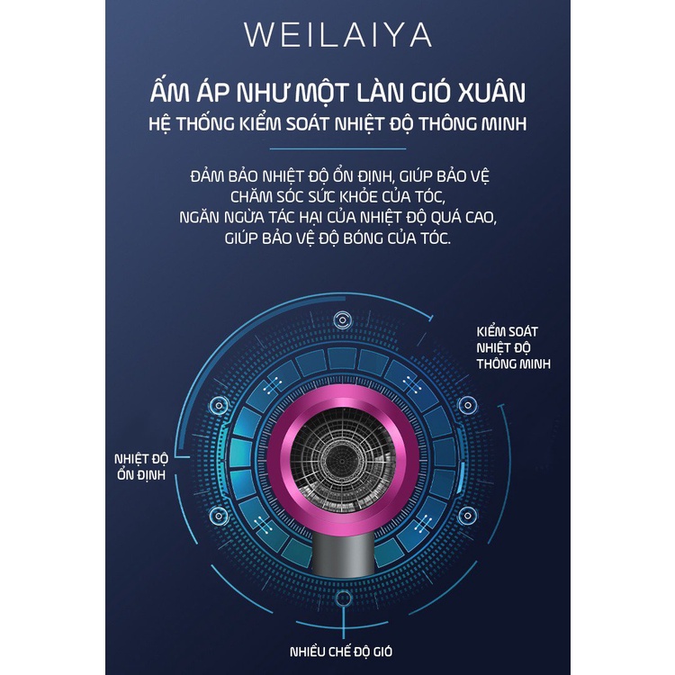 - WEILAIYA !!!!! - Kiểm soát nhiệt độ với 2 mức tốc độ gió -Đáp ứng nhiệt độ cần thiết khi sử dụng . tùy theo tình trạng tóc và mục đích sử dụng mà có thể kết hợp các chế độ làm tóc khác nhau .Thay đổi kiểu tóc theo ý muốn . - 2 chế độ gió : tốc độ cao. - 1 chế độ