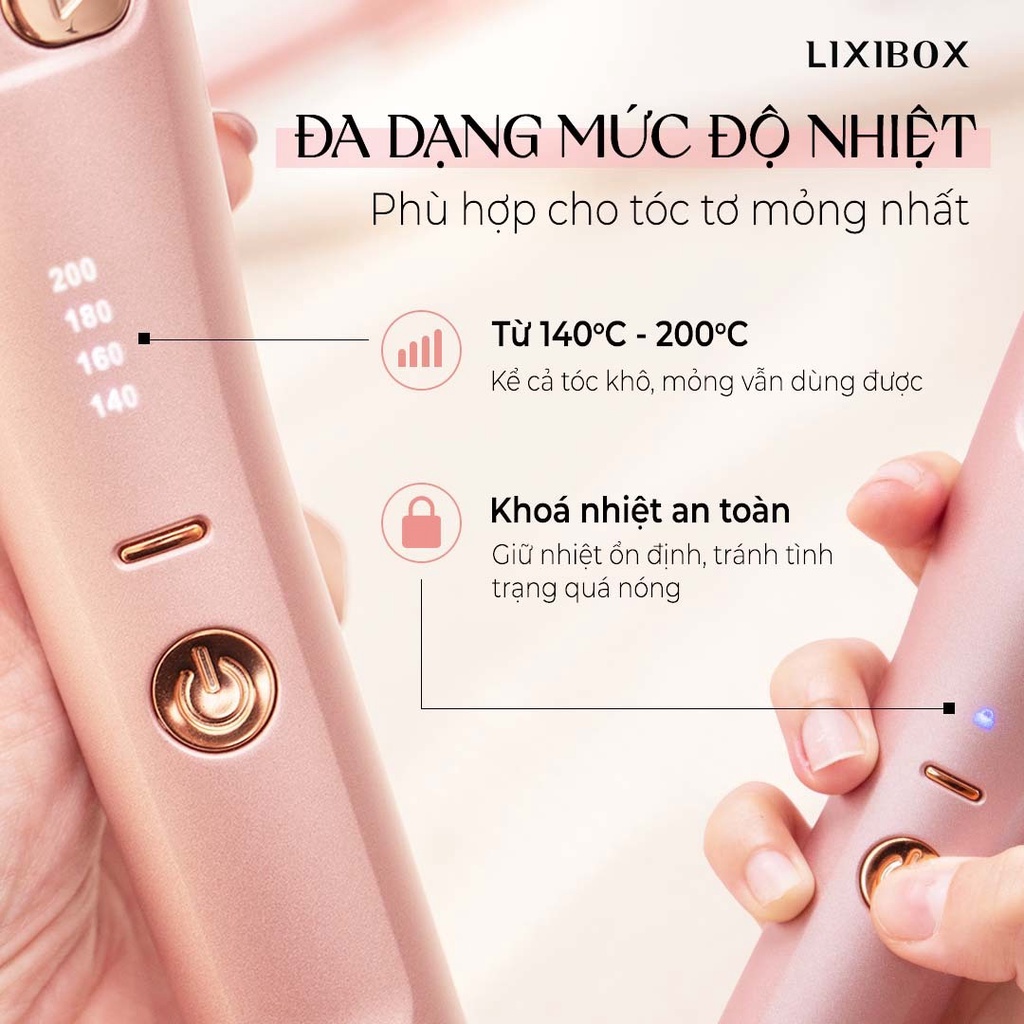 CÔNG NGHỆ MÁY UỐN TÓC TỰ XOAY, ION ÂM HALIO AUTO ROTATING HAIR CURLER Đầu làm xoăn: KHÔNG GÂY khô xơ, đứt gãy như dòng máy uốn tạo nhiệt khác nhờ trục làm từ gốm phủ tourmaline: phân giải ion âm cho mái tóc bóng mượt như salon. Tourmaline hiện là chất liệu có khả năng phân giải Ion âm x6 lần so với vật liệu khác. Tạo được kiểu xoăn lơi, xoăn cúp, xoăn sóng với thiết kế trục tự xoay 360 độ và lõi trục 25mm Nhiệt độ của máy: Phù hợp cho mọi loại tóc, cả tóc tẩy lẫn tóc tơ nhờ 4 chế độ nhiệt 140°C-160°C-180°-200°C Tiết kiệm thời gian uốn xoăn nhờ khả năng làm nóng nhanh, chỉ mất 20-30s để đạt mức nhiệt cao nhất 200°C Ngạnh gỡ rối tóc Silicone: Dễ dàng tạo kiểu cho cả tóc ngắn đến tóc dài với ngạnh Silicone giữ nếp tóc mà không lo xoắn, rối… trong khi uốn Thiết kế máy: An toàn sử dụng với bộ phận an toàn cách nhiệt tránh va chạm với bề mặt tiếp xúc như bàn, đất, ghế,… Nút khóa nhiệt giúp ổn định nhiệt độ Màu rose gold (hồng nhám) thời thượng, bắt mắt. Hiện Máy uốn tóc tự xoay, ion âm Halio đang là dòng máy duy nhất sở hữu màu rose gold trên thị trường. LƯU Ý SỬ DỤNG MÁY UỐN TÓC TỰ XOAY, ION ÂM HALIO AUTO ROTATING HAIR CURLER Chỉ sử dụng máy trên tóc hoàn toàn sạch, khô ráo, không bôi bất kỳ hóa chất nào Sử dụng gel để giữ nếp tóc lâu nhất Không lấy phần tóc quá dày/ nhiều Nên dùng thêm sản phẩm cố định lọn xoăn để tóc giữ nếp tốt hơn Tóc ngắn nên cẩn thận khi sử dụng thiết bị để tránh gây bỏng Luôn tắt máy sau khi sử dụng xong bằng cách nhấn nút nguồn 3s Sau khi sử dụng xong, để máy nguội hoàn toàn trong nhiệt độ phòng trước khi cất Bảo quản ở nơi mát mẻ, khô thoáng CẤU TẠO MÁY UỐN TÓC TỰ XOAY, ION ÂM HALIO AUTO ROTATING HAIR CURLER Bộ phận an toàn cách nhiệt Đầu làm xoăn trục tự xoay 360° bằng gốm phủ tourmaline Ngạnh gỡ rối tóc Silicone Nút điều chỉnh hướng trục xoay: Nút nguồn & điều chỉnh nhiệt độ: sáng đèn khi máy hoạt động.4 chế độ nhiệt: 140°C-160°C-180°-200°C. Nhiệt độ mặc định 140°C Dây điện THÔNG SỐ KỸ THUẬT MÁY UỐN TÓC TỰ XOAY, ION ÂM HALIO AUTO ROTATING HAIR CURLER Kích thước (Chiều dài x chiều rộng x chiều cao): 6*6*36cm (kích thước máy uốn) Nhiệt độ: 140-200 Công suất định mức: 220 - 240V Tần số định mức: 50-60Hz Điện áp định mức: 50W Cách sử dụng 1. Chải và gỡ rối tóc trước khi sử dụng thiết bị 2. Khởi động thiết bị bằng cách ấn nút nguồn 3s cho đến khi thấy đèn hiệu sáng lên 3. Điều chỉnh nhiệt độ máy phù hợp với chất tóc (Nhiệt độ mặc định khi mới mở máy là 140°C) 4. Khi thấy đèn báo ổn định (ngưng nhấp nháy), thiết bị đã sẵn sàng để sử dụng 5. Chia tóc thành nhiều phần nhỏ khoảng 1-2 cm, lần lượt cho vào máy theo lớp tóc, từ trong ra ngoài 6. Cố định 1 phần tóc trên đỉnh trục xoay với một góc 45°, nhấn nút mũi tên trái/ phải trên thân máy để máy bắt đầu cuốn tóc vào trong. 7. Giữ trong vòng 8-10s và tiếp tục với tương tự với toàn bộ các phần tóc còn lại. Thành phần Sản phẩm bao gồm: 1 Máy uốn tóc Halio Auto Rotating Hair Curler 1 Hướng dẫn sử dụng