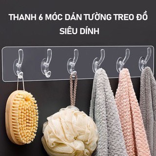 Móc treo quần áo, treo đồ đa năng dán tường trong suốt thanh 6 móc liền nhau siêu chắc.