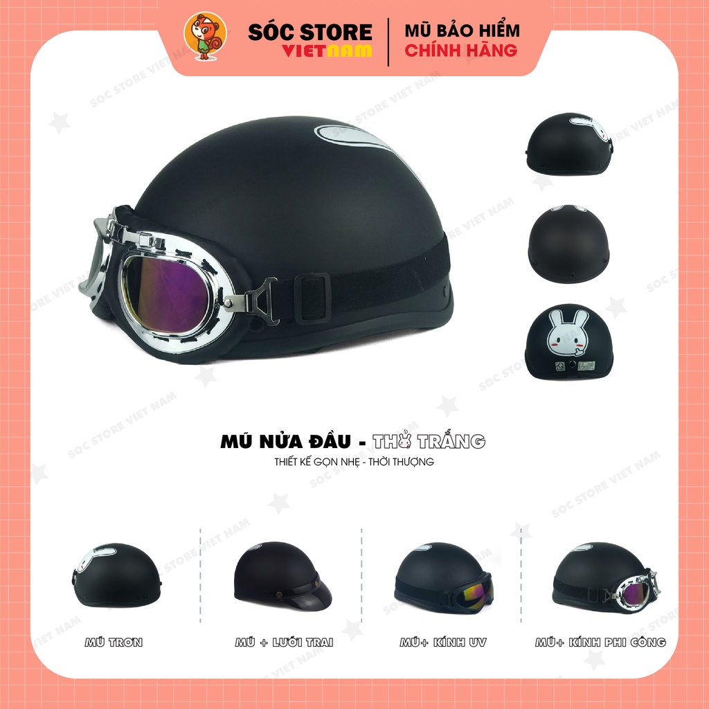Mũ bảo hiểm nửa đầu 1/2 in hình thỏ trắng kính phi công Sóc Store Vietnam, nón bảo hiểm 1/2 thỏ trắng
