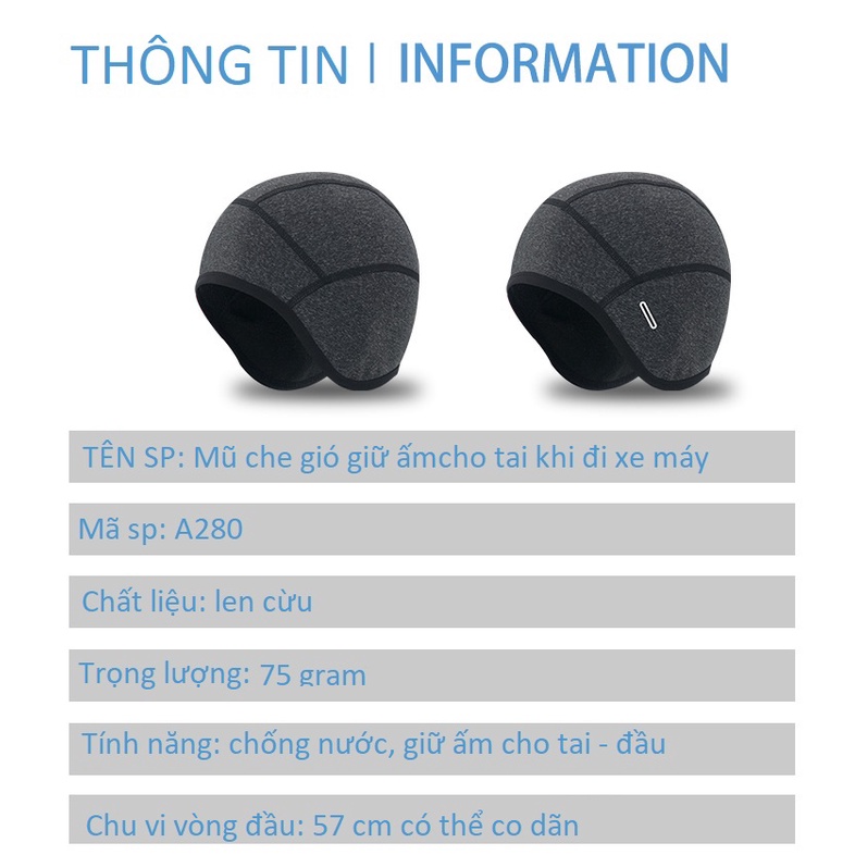 Thông tin sản phẩm: + Tên sản phẩm: mũ chống gió mùa đông cho xe đạp leo núi xe máy A280 + Chất liệu: len cừu dệt + sợi tổng hợp + Trọng lượng: 75 gram + Chu vi vòng đầu: 57 cm có thể co giãn tốt Mùa đông khi đi xe máy và phải đội mủ bảo hiểm thì mọi người rất khó để