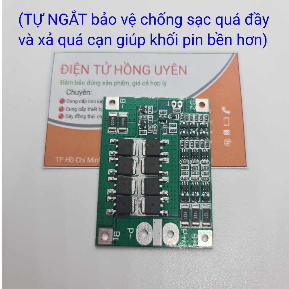Dòng xả liên tục 25A ổn định. Chuyên dùng để đóng khối pin Lithium ion 3S, pin máy khoan và các thiết bị chạy điện từ 10,2V đến 12,6V. - Dòng xả tức thời 35A giúp khối pin không bị quá tải khi khởi động thiết bị. - Mạch sẽ tự ngắt bảo vệ khối pin 3S không xả áp quá th