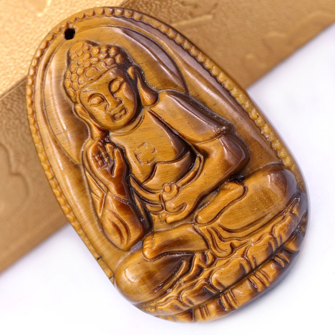 Mặt Phật A di đà đá mắt hổ kèm vòng cổ dây da nâu + móc inox vàng, mặt dây chuyền Phật bản mệnh, vòng cổ mặt Phật