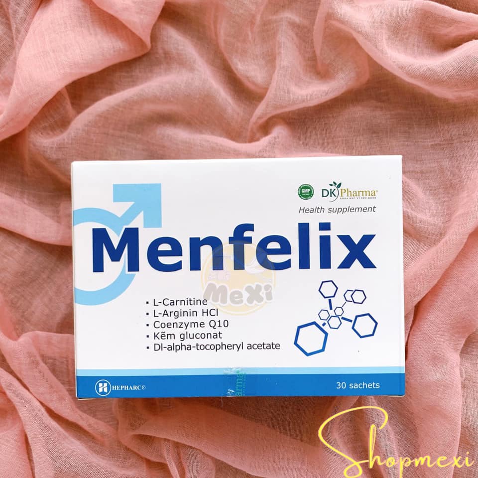 Sản phẩm này không phải là thuốc và không có tác dụng thay thế thuốc chữa bệnh 1. Thông tin sp (tên, xuất xứ, đóng gói) - Tên sản phẩm: Menfelix - Xuất xứ: Việt Nam - Đóng gói: hộp 30 gói 2. Thành phần, hàm lượng L-Carnitine fumarate 1725mg L-Arginin HCl 1000mg Fruc