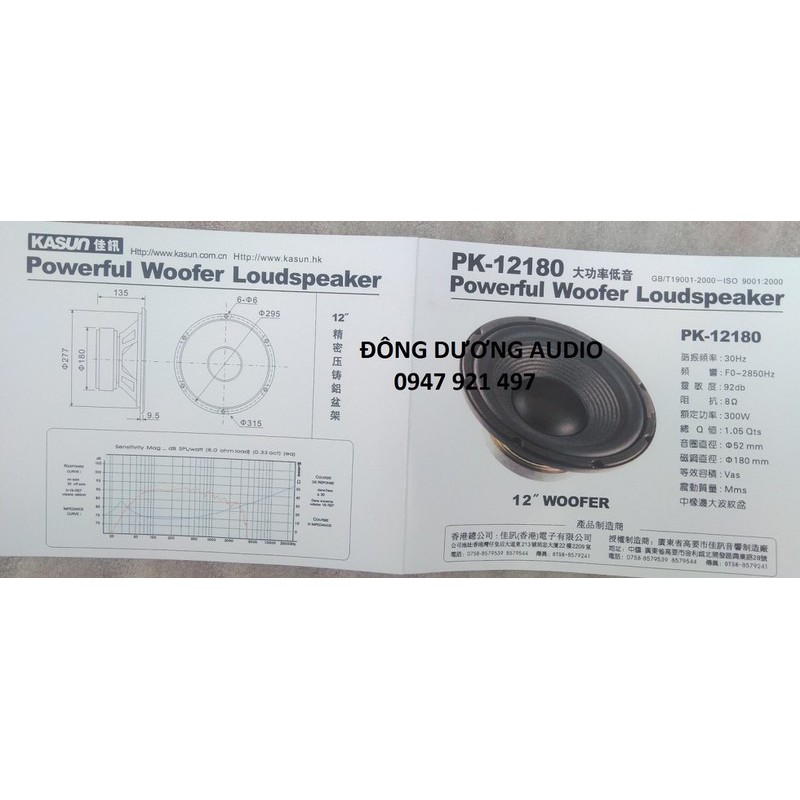 Thông số kỹ thuật loa như sau: Model - PK 12180. gân cao su. màng nhựa cứng chắc chắn, không sợ bong tét, khi đập mạnh hoặc dùng thời gian dài Bass 30 với đường kính toàn vành loa 31cm, Từ đơn: 180mm. Coil: 52mm. Công xuất: 300w. Trở kháng: 8 ohm. Tần số: 30