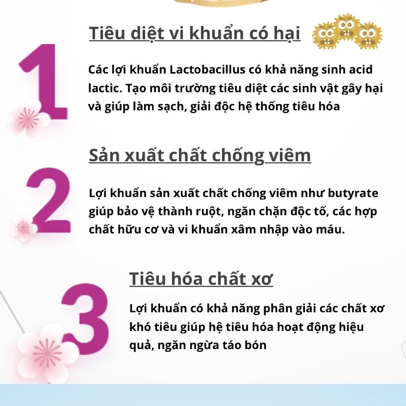 Sâm Tố Nữ Puecolazen Kohinoor- cải thiện nội tiết tốt nữ, giảm quá trình lão hoá da, sạm da Thành phần BioAmicus Probiotic Drops: Trong 5 giọt chứa: Lactobacillus Reuteri (BIO5454) 200 x 106CFU, Lactobacillus Rhamnosus (GG) 100 x 106CFU. Phụ liệu: dầu hướng dương, chất béo trung tính chuỗi trung bình (medium chain triglyceride oil), Silicon dioxide Công dụng BioAmicus Probiotic Drops: Giúp bổ sung lợi khuẩn Lactobacillus Reuteri và Lactobacillus Rhamnosus hỗ trợ cải thiện hệ vi sinh đường ruột. Hỗ trợ giảm triệu chứng rối loạn tiêu hoá do loạn khuẩn đường ruột. Hỗ trợ tăng cường sức đề kháng cho cơ thể Đối tượng sử dụng BioAmicus Probiotic Drops: Trẻ em bị rối loạn tiêu hoá với các triệu chứng như: tiêu chảy, phân sống, đầy bụng khó tiêu, táo bón Người dùng kháng sinh kéo dài gây loạn khuẩn đường ruột Người có nhu cầu bổ sung lợi khuẩn để hỗ trợ tiêu hoá và nâng cao sức đề kháng cho cơ thể. Hướng dẫn sử dụng BioAmicus Probiotic Drops: Trẻ em dưới 1 tuổi sử dụng theo hướng dẫn của bác sĩ (khuyến cáo dùng 5 giọt/lần, ngày dùng 1 lần) Trẻ từ 1 – 12 tuổi: Uống 5 giọt/lần, ngày dùng 1 lần Người trên 12 tuổi: Uống 5 giọt/lần, ngày dùng 1 – 3 lần Nếu đang dùng kháng sinh, hãy dùng ít nhất 2-3 giờ trước hoặc sau khi dùng kháng sinh. Lắc kỹ trước khi sử dụng Không tiếp xúc đầu nhỏ giọt với bất kỳ chất lỏng nào bao gồm cả nước bọt. Lưu ý: Sản phẩm không chứa thành phần biến đổi gen, không chứa hương thực phẩm, màu thực phẩm hoặc chất bảo quản. An toàn cho người sử dụng Sản phẩm không chứa thành phần dễ gây dị ứng như: protein sữa hoặc lactose, các loại hạt, đậu phộng, ngô, đậu nành, gluten, lúa mì, trứng, cá, động vật giáp xác hoặc các thành phần nhân tạo hoặc chất tạo vị hoặc chất tạo hương Không sử dụng nếu buồn nôn, sốt, tiêu chảy ra máu hoặc đau bụng dữ dội. Không sử dụng nếu bạn có tình trạng suy giảm miễn dịch (ví dụ: AIDS, ung thư hạch, bệnh nhân đang điều trị bằng corticosteroid dài ngày). Cảnh báo: Ngừng sử dụng và tham khảo ý kiến bác sĩ nếu các triệu chứng rối loạn tiêu hóa (ví dụ tiêu chảy) trở nên tồi tệ hơn hoặc kéo dài hơn 3 ngày. Nếu trẻ sinh non hoặc có vấn đề về sức khỏe, hãy tham khảo ý kiến của chuyên gia chăm sóc sức khoẻ trước khi sử dụng Lưu ý: Thực phẩm này không phải là thuốc, không có tác dụng thay thế thuốc chữa bệnh Bảo quản lạnh sau khi mở nắp ở nhiệt độ 2 – 80C Thời hạn sử dụng: Hạn dùng in trực tiếp trên bao bì sản phẩm Quy cách bao gói: Lọ 10ml tương ứng 50 liều Thương nhân chịu trách nhiệm về chất lượng hàng hóa: CÔNG TY CỔ PHẦN VÀ KINH DOANH PHÁT TRIỀN HOÀ BÌNH Xuất xứ: Canada Sản xuất tại: BIOAMICUS LABORATORIES INC. Địa chỉ:106-3150 Dufferin Street Toronto, Ontario M6A2T1, Canada Số đăng ký: 2333/2020/ĐKSP Sự An Tâm Của Bạn Là Kim Chỉ Nam Của NHÀ THUỐC 💞Nhà Thuốc Chính Hãng 103 tập trung mang đến những giá trị thật cho mỗi gia đình. 💞Chúng tôi đảm bảo 100% thuốc chính hãng, được kiểm duyệt bởi Bộ Y Tế, và có hạn sử dụng xa. 💞 FREESHIP nội thành Hà Nội với đơn hàng từ 150k, và toàn quốc với đơn hàng từ 250k