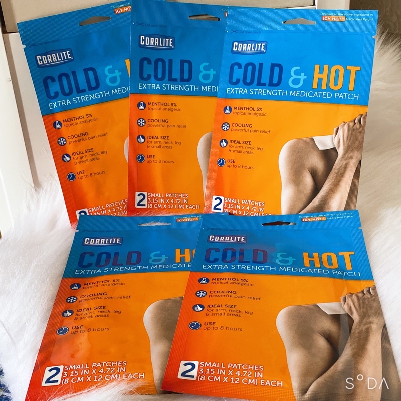 Miếng dán COLD& HOT Extra Strength Medicated Patch 2 miếng (8x12cm) Menthol 5% mát lạnh giảm đau tại chỗ Miếng dán COLD& HOT có thành phần tinh dầu Menthol (Bạc Hà) 5% mát lạnh làm giảm đau tại chổ do căng cơ, đau cơ, xương khớp, bong gân… Công dụng - làm giảm tạm th