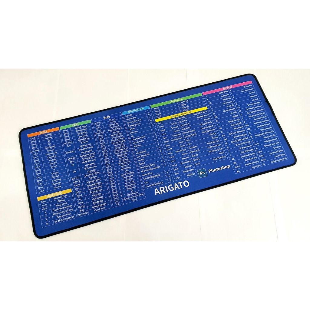 Miếng Lót Chuột Phím Tắt Máy Tính Cỡ Lớn 70x30 May Bo Viền In Sắc Nét Không Bay Màu Chống Trơn Trượt - Arigato THÔNG TIN MIẾNG LÓT CHUỘT: ✅Kiểu dáng hình chữ nhật ✅Size : 700x300x2mm ✅Chất liệu : Cao su ✅Bề mặt : Trơn - Nhẵn 👉MÔ TẢ MIẾNG LÓT CHUỘT: ✅Lót chuột có chất lượng in tốt đảm bảo không phải màu ✅Có thể giặt tay, dùng bản chải đánh cho sạch ✅Đế chống trơn trượt. ✅Giúp việc điều khiển chuột nhanh nhạy và chính xác hơn ✅Sợi vải cấu trúc chống bám đặc biệt tối ưu hóa khả năng điều khiển chuột ✅Bo viền chống rách tăng độ bền cho bàn di ✅Trang trí hình ảnh sinh động, đẹp mắt ✅Miếng lót chuột sẽ góp phần không nhỏ vào những thao tác chính xác và nhanh nhẹn với chuột của các game thủ, nhất là các game đòi hỏi thao tác nhanh nhẹn và chính xác. ✅Sản phẩm được àm từ sợi vải cấu trúc chống bám đặc biệt tối ưu hóa khả năng điều khiển chuột. ✅Đế cao su bám mặt bàn tốt, chống trượt đảm bảo chuột di chuyển mượt mà ✅Có thể sử dụng với chuột quang, chuột bi và hầu hết các loại chuột laser thông dụng. Tính năng này giúp bạn sử dụng sản phẩm hiệu quả hơn và không phải thay mới khi thay đổi loại chuột máy tính #lotchuot #mienglotchuot