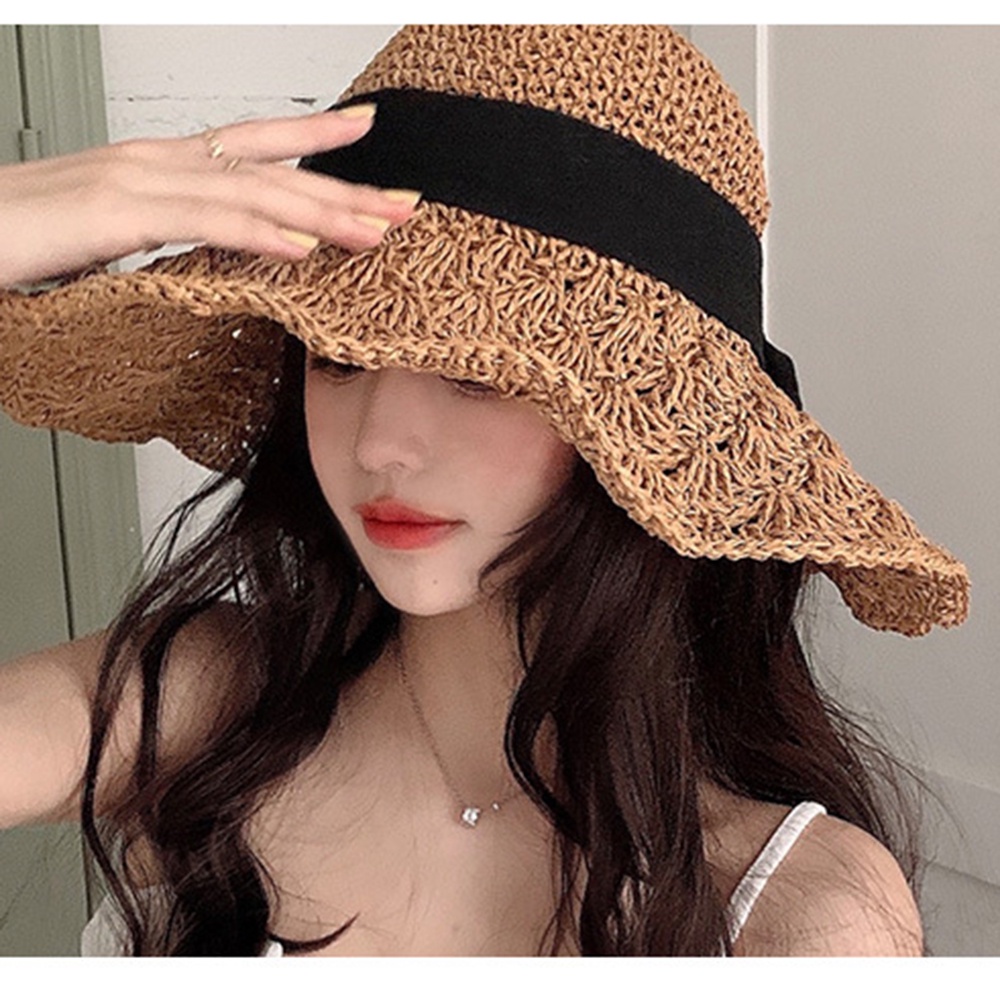 Nón cói rộng vành lượn sóng vành 12cm thắt nơ cói mềm thuận tiện gấp gọn bỏ túi xách