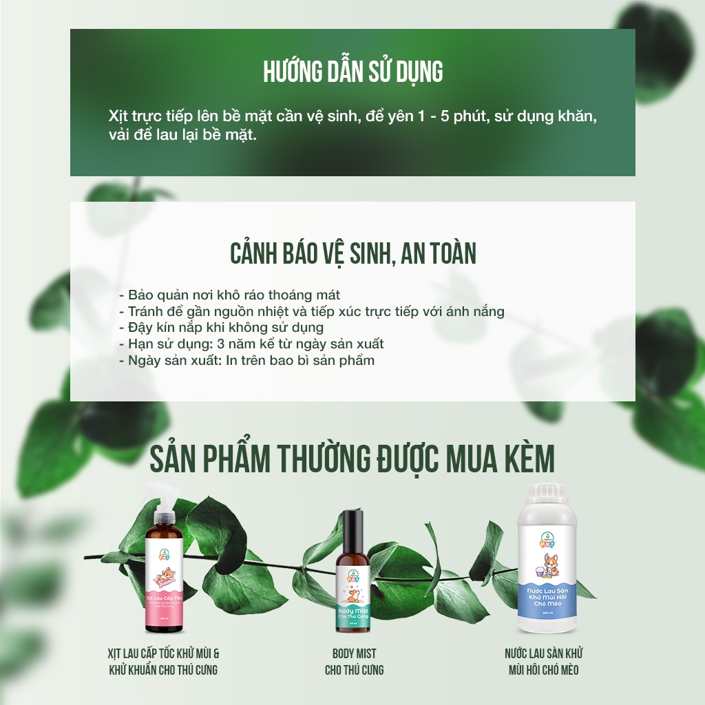 Xịt lau sàn cấp tốc khử mùi và khử khuẩn cho thú cưng với mùi hương tự nhiên kết hợp từ các nguyên liệu thiên nhiên: Tinh dầu Oải Hương, Tinh dầu Khuynh Diệp, Tinh dầu Sả Chanh giúp đánh bay mọi vết bẩn, mùi hôi mà thú cưng nhà bạn lỡ vấy bẩn. THÔNG TIN SẢN PHẨM 1.