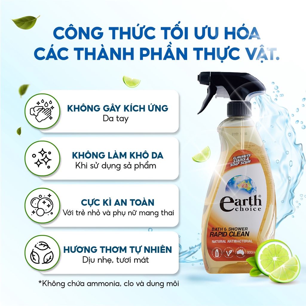 ✨ Nước Tẩy Rửa EARTH CHOICE Dành Cho Nhà Tắm Làm Sạch Đa Góc Độ Những Vết Bẩn Cứng Đầu Dung Tích 600ml 🍀 THÀNH PHẦN - Xuất xứ: Úc - Thương hiệu: EARTH CHOICE - Mùi hương: Cam Chanh - Thể tích: 600ml 🍀 ĐỐI TƯỢNG SỬ DỤNG - Tẩy rửa nhà cửa. 🍀 CÔNG DỤNG SẢN PHẨM