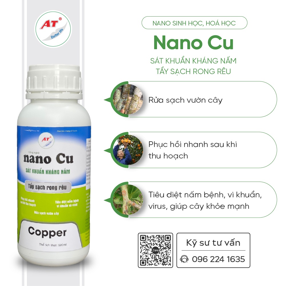 Nano đồng sát khuẩn, diệt nấm, tẩy sạch rong rêu, rửa vườn phục hồi nhanh sau thu hoạch – AT Nano Cu 1,5 copper 500ml.