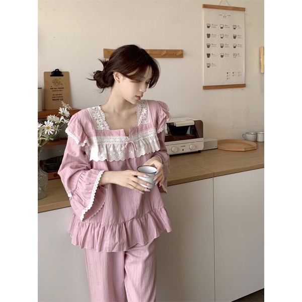 New SET BỘ MẶC NHÀ TIỂU THƯ DÀI TAY HỒNG PHỐI REN TRẮNG rẻ nhất shopee