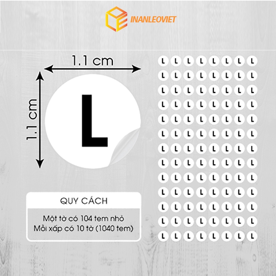 - Nhãn trắng đã bế sẵn chỉ cần gỡ và dán đa dạng kích thước 1.1cm dành dán size áo, giày, dép - Chất liệu: Decal giấy - Hình tròn gồm có kích thước: 1.1cm - Số lượng mua theo tờ - Số nhãn trên 1 tờ: 104 tem/tờ - Size: XS, S, M, L, XL, XXL Số lượng mua tính 1 tờ. Ngoài