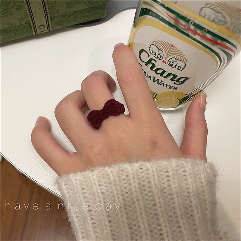 Nhẫn Hở Hình Nơ Bằng Nhung Màu Đỏ Rượu Phong Cách Vintage Dễ Thương Có Thể Điều Chỉnh