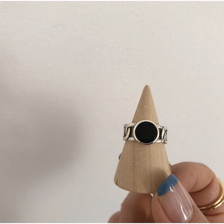 Nhẫn nữ bạc 925 hở thiết kế mặt tròn đá đen và xoắn bạc bản lớn cá tính phong cách Hàn Quốc Boho Kaila