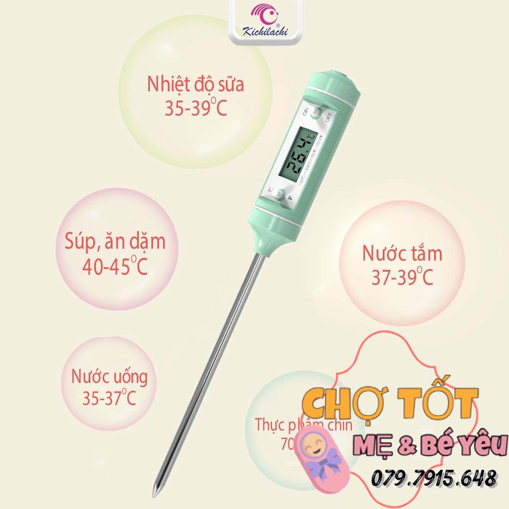 CHỢ TỐT MẸ VÀ BÉ YÊU - HÀNG CHUẨN GIÁ HOT - GIAO HÀNG SIÊU TỐC ☎️: 0797915648 ⚠️ Shop tích hợp kênh vận chuyển NOWSHIP & GRAB EXPRESS khách cần gấp ĐẶT HÀNG NHẬN NGAY nội thành HCM. ✏️: Hình thật shop chụp, các bạn tham khảo & yên tâm mua sắm nhé ! ------------------------------------------- THÔNG TIN SẢN PHẨM : NHIỆT KẾ ĐIỆN TỬ ĐO NƯỚC PHA SỮA, NƯỚC TẮM, THỨC ĂN ĐA NĂNG ✔️ Thông tin chung: ➖ Thương hiệu: Kichi ➖ Nhiệt kế đo nước pha sữa dùng đo nhiệt độ sữa, nước tắm, thức ăn cho bé. ➖ Nhiệt kế đo nước pha sữa đo được nhiệt độ từ -50 độ - 300 độ. ➖ Nhiệt kế đo nước pha sữa có nắp đậy vệ sinh như hình chiếc bút. ➖ Nhiệt kế đo nước pha sữa có kết quả chỉ sau vài giây. ➖ Nhiệt kế đo nước pha sữa chính xác nhiệt độ 99,9%. ➖ Nhiệt kế đo nước pha sữa có chế độ chuyển đổi độ F/C. ✔️ Thông số kỹ thuật: ➖ Màu sắc: Xanh. ➖ Màn hình: LCD. ➖ Đầu thử bằng inox 304, không gỉ, dẫn nhiệt tốt, thân nhiệt kế bằng nhựa ABS. ➖ Đầu thử dài 10.5cm, toàn bộ nhiệt kế dài 18.5cm. ➖ Pin: LR44.