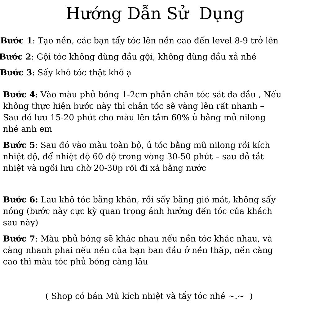 Nhuộm phủ bóng 5D Hàn Quốc nhuộm màu khói tím 450ml/chai Shop mình bán màu phủ bóng 5D đủ màu trong bảng anh em nhé - Chai 450ml - Dạng màu phủ bóng - Hướng dẫn sử dụng xem ảnh shop đăng ạ Ưu điểm: - màu bền, lên màu nhanh - Chai lớn dùng tiết kiệm - Nhiều màu dễ lựa chọn Hướng dẫn sử dụng màu phủ bóng 5D – NEV COLOR Lưu ý: TÓC PHẢI CÓ NỀN 8-9 trở lên Bước 1: Tạo nền, các bạn tẩy tóc lên nền cao đến level 8-9 trở lên Bước 2: Gội tóc không dùng dầu gội, không dùng dầu xả nhé Bước 3: Sấy khô tóc thật khô ạ Bước 4: Vào màu phủ bóng 1-2cm phần chân tóc sát da đầu – Nếu không thực hiện bước này thì chân tóc sẽ vàng lên rất nhành – Sau đó lưu 15-20 phút cho màu lên tầm 60% ủ bằng mủ nilong nhé anh em Bước 5: Sau đó vào màu toàn bộ, ủ tóc bằng mũ nilong rồi kích nhiệt độ, để nhiệt độ 60 độ trong vòng 30-50 phút – sau đỏ tắt nhiệt và ngồi lưu chờ 20-30p rồi đi xả bằng nước Bước 6: Lau khô tóc bằng khăn, rồi sấy bằng gió mát, không sấy nóng (bước này cực kỳ quan trọng ảnh hưởng đến tóc của khách sau này) Bước 7: Màu phủ bóng sẽ khác nhau nếu nền tóc khác nhau, và càng nhanh phai nều nền của bạn ban đầu ở nền thấp, nền càng cao thì màu tóc phủ bóng càng lâu.