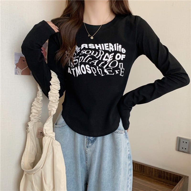 NRVP Áo thun nữ dài tay họa tiết chữ phong cách Hàn Quốc