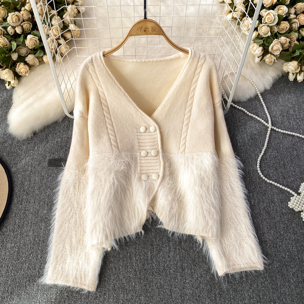 Áo len cardigan cổ V cài khuy phối voan vạt áo điệu đà tiểu thư vintage Hàn Quốc
