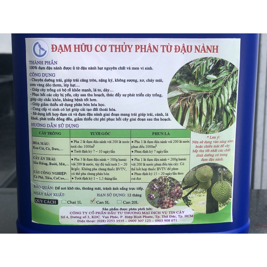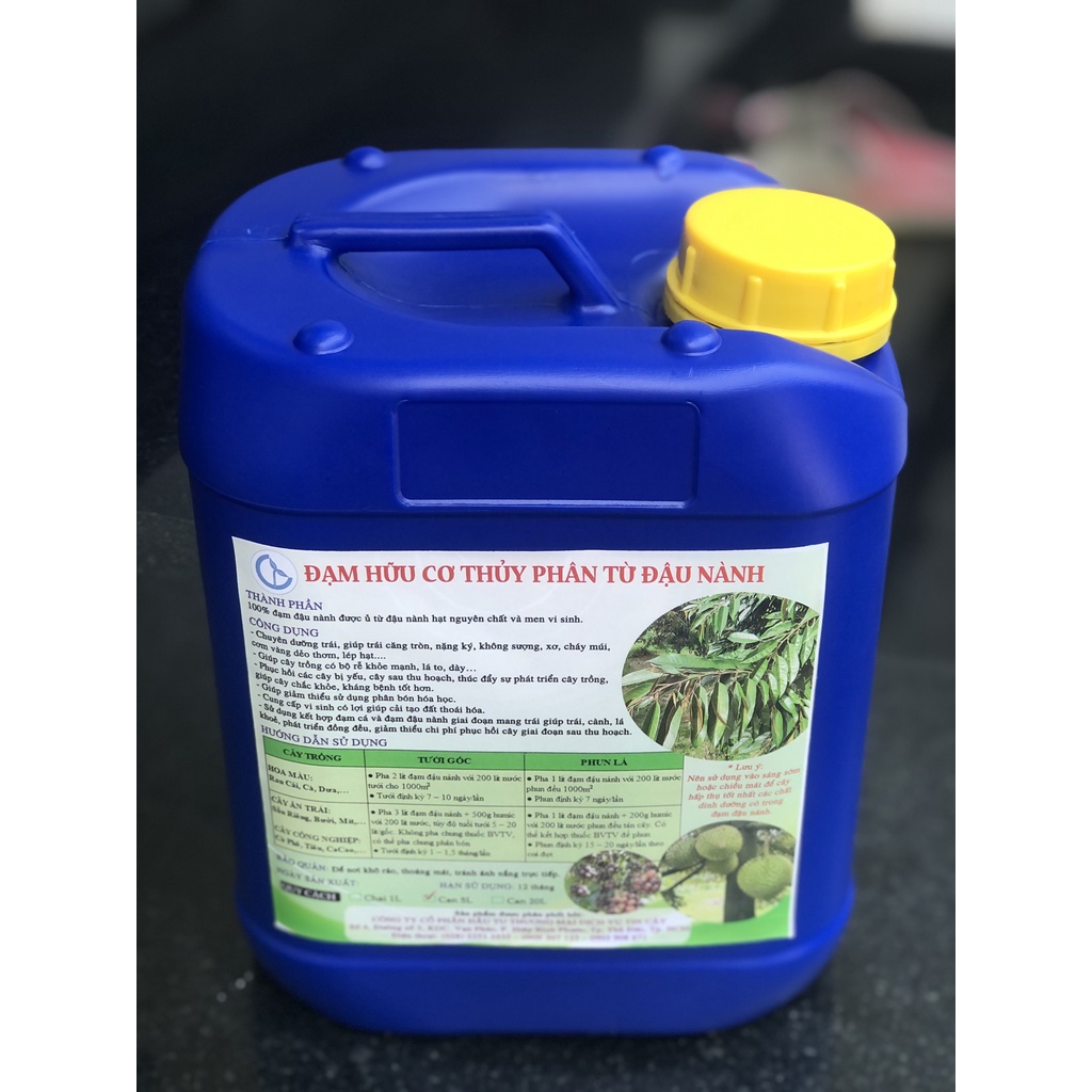 Phân Đậu Nành – Đạm Hữu Cơ Thủy Phân Từ Đậu Nành Sản xuất tại: Việt Nam Quy cách: Can 5 lít Thành phần của Phân đậu nành 100% đạm đậu nành được ủ từ đậu nành hạt nguyên chất và men vi sinh. Công dụng của Phân đậu nành Chuyên dưỡng trái, giúp trái căng tròn, nặng ký, không sượng, xơ, cháy múi, cơm vàng dẻo thơm, lép hạt…. Giúp cây trồng có bộ rễ khỏe mạnh, lá to, dày… Phục hồi các cây bị yếu, cây sau thu hoạch, thúc đẩy sự phát triển cây trồng, giúp cây chắc khỏe, kháng bệnh tốt hơn. Giúp giảm thiểu sử dụng phân bón hóa học. Cung cấp vi sinh có lợi giúp cải tạo đất thoái hóa. Sử dụng kết hợp đạm cá và đạm đậu nành giai đoạn mang trái giúp trái, cành, lá khoẻ, phát triển đồng đều, giúp giảm thiểu chi phí phục hồi cây giai đoạn sau thu hoạch. ***Hướng dẫn sử dụng - HOA MÀU: Rau Cải, Cà, Dưa,… + Tưới gốc: Pha 2 lít đạm đậu nành với 200 lít nước tưới cho 1000m2. Tưới định kỳ 7 – 10 ngày/lần. + Phun lá: Pha 1 lít đạm đậu nành với 200 lít nước phun đều 1000m2. Phun định kỳ 7 ngày/lần. - CÂY ĂN TRÁI: Sầu Riêng, Bưởi, Mít,… CÂY CÔNG NGHIỆP: Cà Phê, Tiêu, Cacao,… + Tưới gốc: Pha 3 lít đạm đậu nành + 500g humic với 200 lít nước, tùy độ tuổi tưới 5 – 20 lít/gốc. Không pha chung thuốc BVTV, có thể pha chung phân bón. Tưới định kỳ 1 – 1,5 tháng/lần. + Phun lá: Pha 1 lít đạm đậu nành + 200g humic với 200 lít nước phun đều tán cây. Có thể kết hợp thuốc BVTV để phun. Phun định kỳ 15 – 20 ngày/lần theo cơi đọt Bảo Quản: Để nơi khô ráo, thoáng mát, tránh ánh nắng trực tiếp. Thời gian sử dụng: 12 tháng kể từ ngày sản xuất