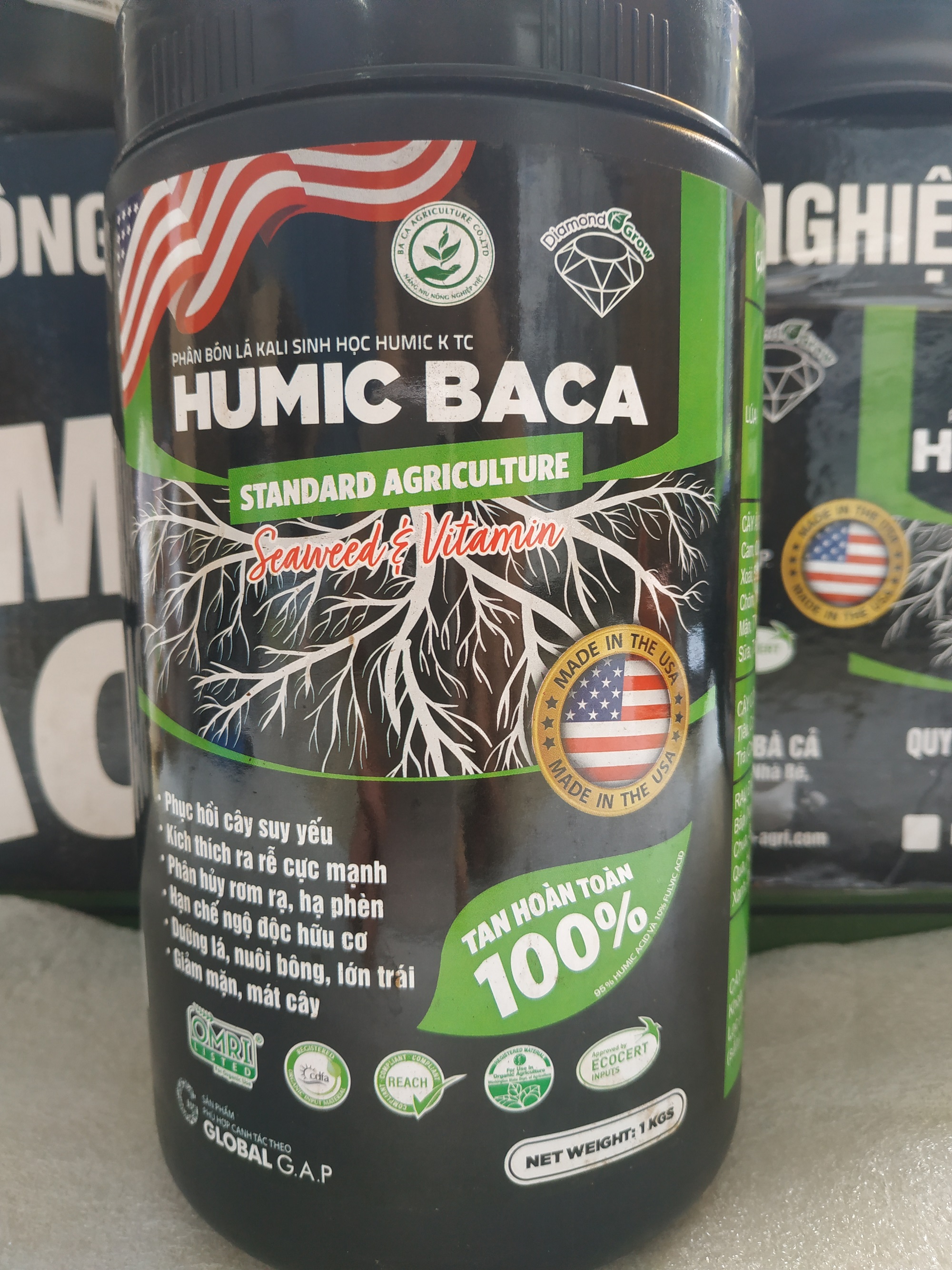 PHÂN BÓN SINH HỌC HUMIC BACA - CHAI 1KG THÀNH PHẦN : Acid humic: 40%, K2O : 5% , pH : 5 , độ ẩm: 25% Ngoài ra còn bổ sung các chất phụ gia như dịch chiết xuất từ cây rong biển, Vitamin C, Amino axit, Fulvic axit, Vitamin B1, vitamin E CÔNG DỤNG : - Humic Baca là sản phẩm phân bón lá kali sinh học kết hợp với axit humic ( kali humate) giúp cây ra rễ nhanh, phục hồi và tái tạo bộ rễ. - Cải tạo đất tơi xốp, thông thoáng đất. Giải độc, hạ phèn nhanh, giúp cây bật rễ nhanh, mạnh và tái tạo bộ rễ. Giải độc hữu cơ, phân hủy nhanh gốc rơm, rạ, thành phần hữu cơ - Giúp lúa ra rễ nhanh, đẻ nhánh hữu hiệu, lá xanh, cứng cây, chống đổ ngã. - Cung cấp dinh dưỡng thiết yếu, dễ hấp thụ cho cây trong suốt thời kỳ sinh trưởng, trong giai đoạn cây con - Cây bật chồi, phân cành mạnh, lá xanh, bóng mượt - Hạn chế rụng hoa và trái non. Hạn chế xơ đen - Giúp cây ăn trái, cây công nghiệp phục hồi nhanh sau thu hoạch HƯỚNG DẨN SỬ DỤNG : - Lúa :bón lót, bón thúc : trộn 1-2 kg humic với lân và ure trước gieo sạ hoặc cấy ( sau khi gạn, chắt nước ). + Trộn với phân bón thúc đợt 1 hoặc đợt 2. + Trộn 1-2 kg humic baca/ha với NPK - Cây ăn trái : cam, quýt, bưởi, xoài, sầu riêng, chôm chôm , nhãn, vải thiều, thanh long, vú sữa, tá : trộn chung với phân bón gốc : sử dụng 4-6 kg / 1 ha/ mỗi lần bón - Cây công nghiệp : tiêu, cà phê, cacao, trà, điều : sử dụng 1 kg humic với 600-800 lít nước, tưới 5-10 lít/gốc - Rau đậu các loại : bắp, dưa, cà chua, ớt, bầu bí, khổ qua, hành hẹ, đậu xanh, đậu nành, mè: sử dụng 1 kg humic pha 800-1000 lít nước, phun đều, đẫm cả cây. - Cây lấy củ : khoai lang, khoai môn, lạc, đậu phộng, mỳ : sử dụng 0.5-1 kg humic/ 1000m2/ mỗi lần bón, hoặc pha 25g với 25 lít nước phun sau khi trồng để cây nhanh bén rễ, bắt phân, bật chồi mới. BẢO QUẢN VÀ AN TOÀN : Bảo quản nơi khô ráo thoáng mát, tránh xa tầm tay trẻ em Hạn sử dụng : 2 năm Nhà sản xuất : Humic Growth Solutions, Inc . USA Giá sản phẩm trên Tiki đã bao gồm thuế theo luật hiện hành. Bên cạnh đó, tuỳ vào loại sản phẩm, hình thức và địa chỉ giao hàng mà có thể phát sinh thêm chi phí khác như phí vận chuyển, phụ phí hàng cồng kềnh, thuế nhập khẩu (đối với đơn hàng giao từ nước ngoài có giá trị trên 1 triệu đồng).....