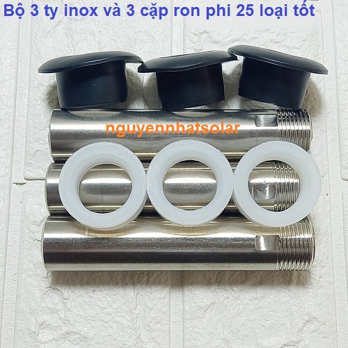Chất liệu: Inox, silicon, cao su Làm kín đầu kết nối đầu nước vào và ra Chịu nhiệt tốt Phù hợp máy nước nóng NLMT có đầu kết nối phi 25 (Hay còn gọi là 27) Sử dụng: dùng cho máy năng lượng khu vực dẫn nước ra vào của máy năng lượng, chắn bụi, chịu lực, bảo vệ foaming Ty Inox 25 dùng máy năng lượng khu vực dẫn nước ra vào của máy năng lượng mặt trời Gioăng hay gọi là ron dùng cho ty phi 25 là loại phổ biến và thông dụng nhất hiện nay, chúng là một bộ phận chi tiết nhỏ không thể thiếu trong máy năng lượng mặt trời. Được sử dụng tại khu vực kết nối giữa máy năng lượng và các ống dẫn nước ra vào của máy nước nóng năng lượng mặt trời. Khả năng đàn hồi và chịu nhiệt độ cao giúp cho roon ty luôn giữ kín ống dẫn với bình bảo ôn, có độ bền ổn định. Tuy nhiên đây là khu vực hay xảy ra hư hỏng nhất, chúng là nơi thường xuyên va chạm, thường xuyên chịu tác động của ngoại cảnh hay con người. khi chúng có dấu hiệu hư hỏng rò rì nước quý khách lên thay thế kịp thời để lâu ngày sẽ làm hư hỏng các bộ phận khác của máy năng lượng mặt trời, gây thiệt hại và tốn kém. Gioăng silicon chịu nhiệt phi 25 tác dụng làm kín, chống thấm nước, hiện tượng rò rỉ, tràn nước ở các đầu nước vào và đầu nước ra của máy nước nóng năng lượng mặt trời có đầu kết nối vào – ra phi 25. Gioăng (ron) cao su phi 25 chịu lực có tác dụng chịu lực phụ kiện kết nối đầu nước vào – ra dùng cho máy nước nóng năng lượng mặt trời có đầu kết nối phi 25, có tác dụng phụ chắn bụi, bảo vệ foaming