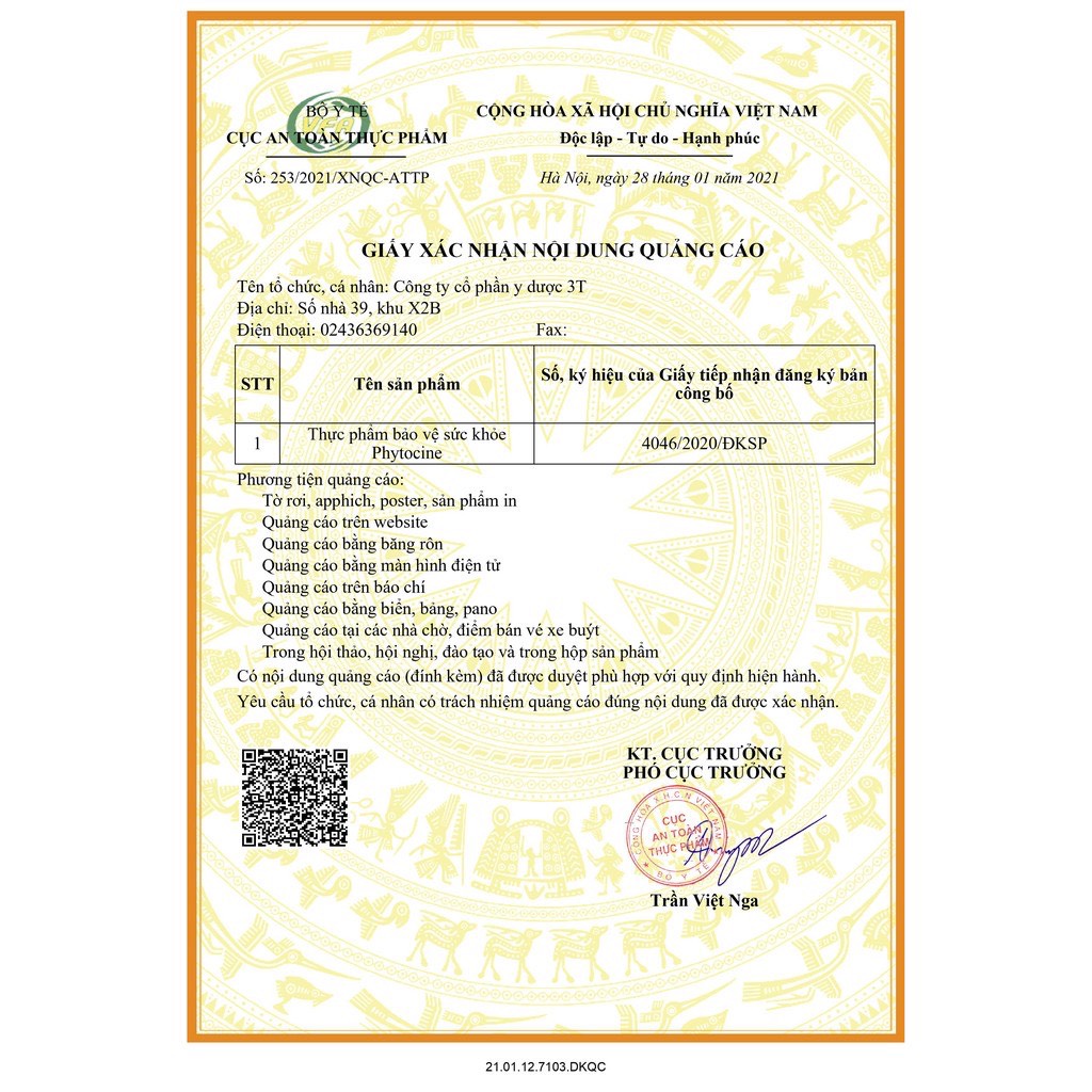 Công dụng của Phytocine Theo giấy xác nhận nội dung quảng cáo số 253/2021/XNQC-ATTP H thì sản phẩm Phytocine – Cao Xuyên Tâm Liên 250mg có công dụng giúp hỗ trợ giảm các triệu chứng ho sốt, đau rát họng, nhiều đờm, khản tiếng do viêm họng, viêm phế quản, phổi, viêm am