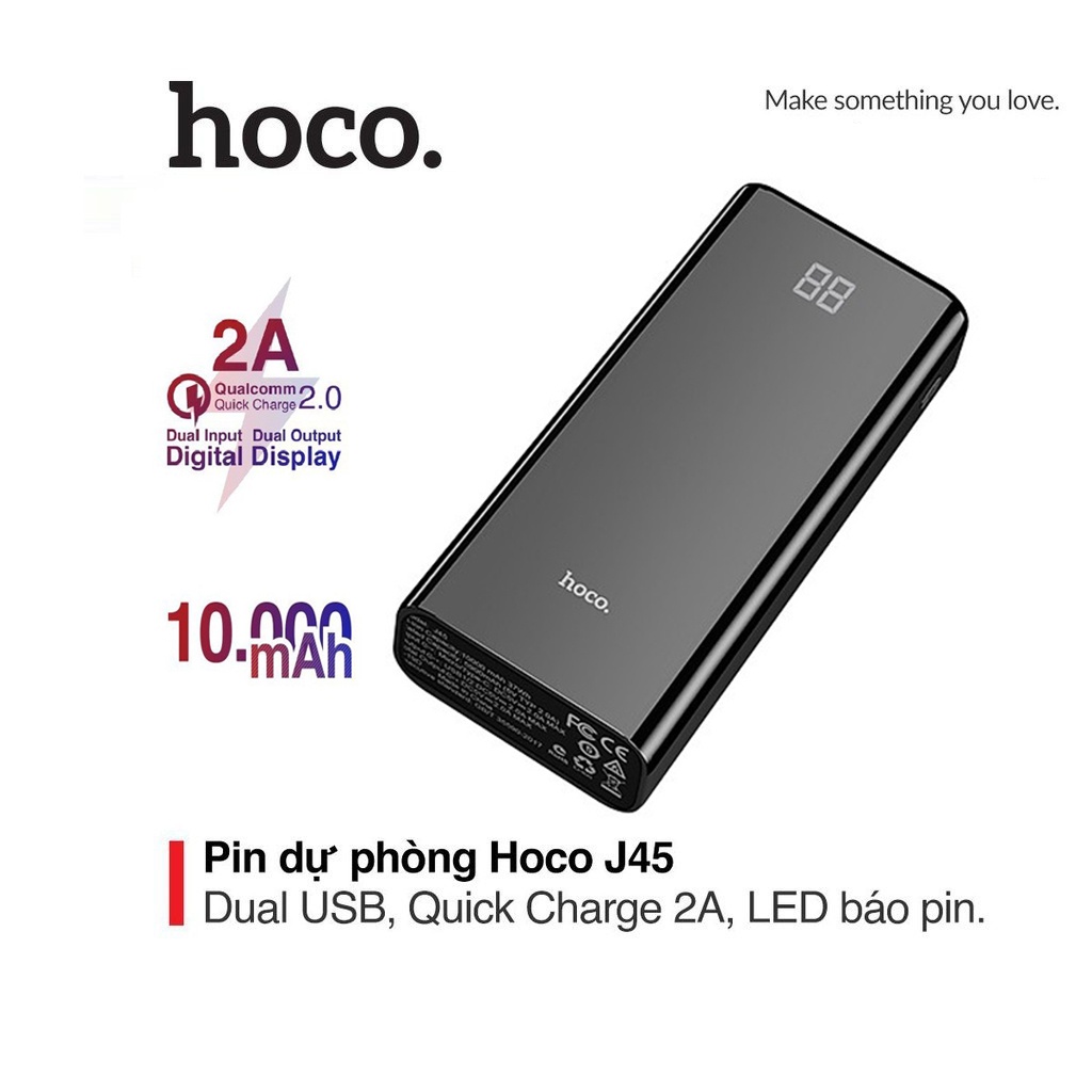 Pin dự phòng Hoco J45 đèn LED dung lượng 10000mAh hỗ trợ 2 cổng sạc chất liệu PC chống cháy Sản phẩm giao tới khách hàng hoàn toàn nguyên seal. Bảo hành 6 tháng chính hãng, lỗi đổi mới (1 đổi 1) Khách hàng vui lòng bảo quản sản phẩm, hộp, phụ kiện để được bảo hành đổ