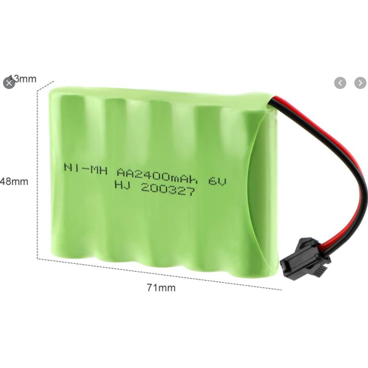 Pin 6V - 2400mAh - Ni-Mh là loại pin Ni-Mh, dung lượng cao 2400mAh, thích hợp dùng cho các loại xe ô tô đồ chơi điều khiển từ xa. Kích thước pin nhỏ gọn, gồm 5 cell pin Thông số Pin 6V - 2400mAh - Ni-Mh Kích thước pin: 65mm 50mm 14mm. Dòng điện sạc 250mA Ưu điểm của P
