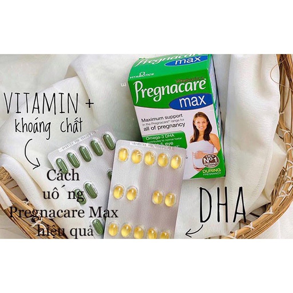 Sản phẩm này không phải là thuốc và không có tác dụng thay thế thuốc chữa bệnh THÔNG TIN SẢN PHẨM Xuất xứ: Anh Thương hiệu: Vitabiotics- Bề dày hơn 45 kinh nghiệm nghiên cứu và phát triển Quy cách đóng gói Hộp 84 viên trong đó: 56 viên Pregnacare Max (màu xanh) và 28 viên Omega-3 (màu vàng) ĐỐI TƯỢNG SỬ DỤNG Phụ nữ có ý định mang thai, phụ nữ mang thai và phụ nữ cho con bú THÀNH PHẦN - Viên màu xanh gồm acid folic (200mcg), các vitamin A, vitamin D, vitamin E,… các vi chất như sắt, magie,kẽm,… - Viên màu vàng có 300mg DHA và 60mg EPA TẠI SAO NÊN DÙNG PREGNACARE MAX? - Pregnacare Max bổ sung đầy đủ dưỡng chất và vitamin cho một thai kì khỏe mạnh đặc biệt là axit folic, DHA theo đủ nhu cầu khuyến cáo.Sử dụng sớm axit folic làm giảm dị tật ống thần kinh của thai nhi. DHA giúp não bộ và mắt phát triển một cách khỏe mạnh. - Làm giảm các triệu chứng ốm nghén trong 3 tháng đầu của thai kì. Đặc biệt Pregnacare Max không gây táo bón - Pregnacare Max không chứa các chất tạo màu, không chứa các chất dễ gây dị ứng có nguồn gốc từ trứng sữa CÁCH DÙNG PREGNACARE MAX Ngày uống 2 viên xanh và 1 viên vàng sau ăn Phụ nữ nên bắt đầu uống Pregnacare Max trước khi mang thai 1 tháng, và duy trì trong và cả sau mang thai