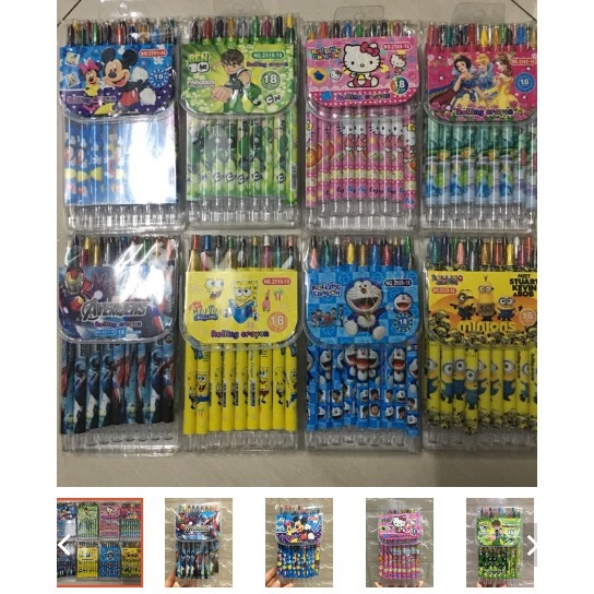 Sáp vặn 18 màu loại cây dài đựng trong vỉ nhựa dẻo .1 hộp sáp 18 màu có 18 cây sáp khác nhau .Có vỏ nhựa bọc ngoài cây sáp .Khi tô màu xoay lên -vặn xuống không lo bị gẫy sáp .Màu sắc tươi sáng , ...