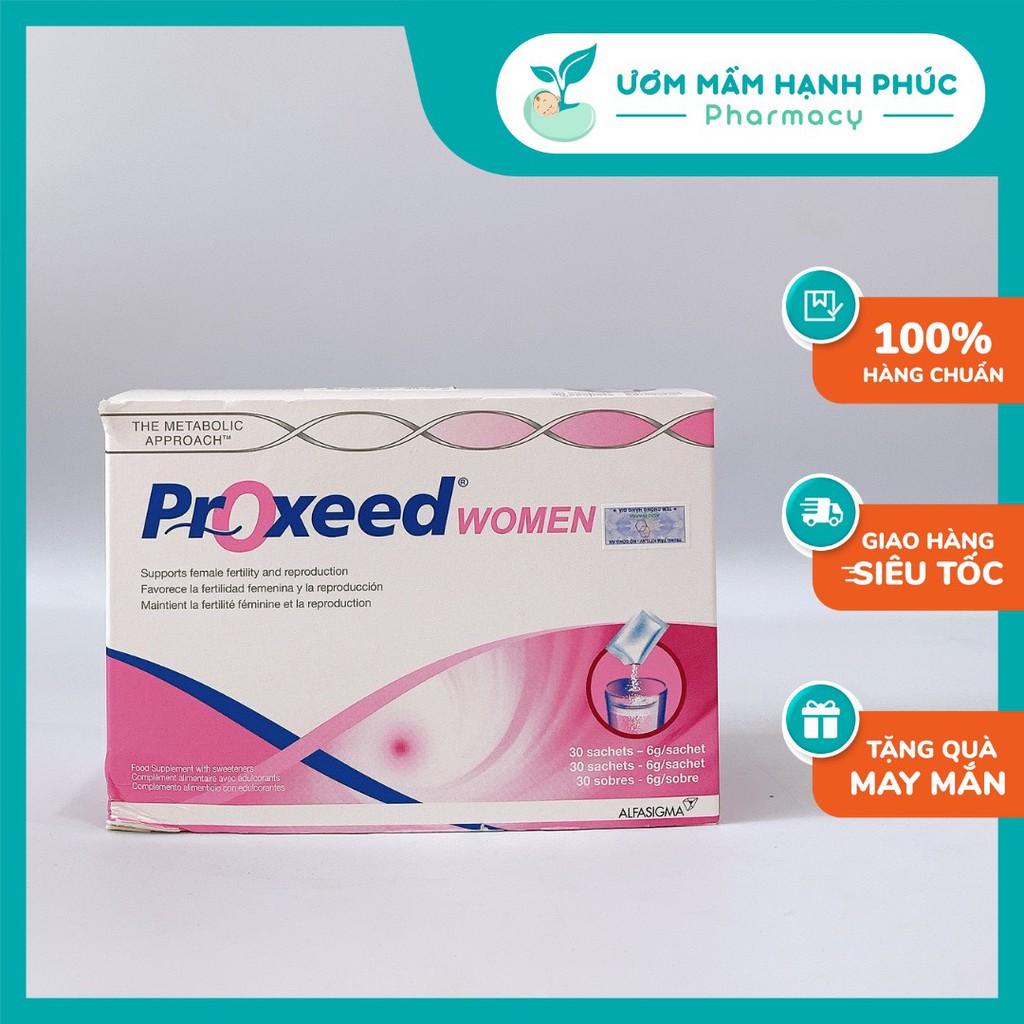 👉 PROXEED WOMEN – Cải thiện chất lượng tế bào trứng – Hỗ trợ vô sinh nữ – Tối ưu hóa sức khỏe sinh sản nữ giới – Bổ sung các dưỡng chất thiết yếu cần cho quá trình thụ thai – Phục hồi cân bằng năng lượng, giảm stress oxy hóa – Cân bằng nội tiết, điều hòa kinh nguyệt Sản phẩm được nghiên cứu và sản xuất bởi Sigma-tau S.p.A - Italy, trên dây truyền công nghệ hiện đại, đáp ứng tiêu chuẩn Châu Âu. 👉 CÔNG DỤNG – Cải thiện chất lượng nang noãn, giúp điều hòa nội tiết tố nữ, kích thích sự rụng trứng đối với các trường hợp bệnh nhân buồng trứng đa nang, trứng kém, rụng trứng không đều. – Cung cấp đầy đủ các vitamin và dưỡng chất cần thiết cho quá trình hình thành noãn (trứng), bảo vệ nang noãn (trứng) khỏi sự phá hoại của các tác nhân oxy hóa. – Hỗ trợ phân chia tế bào khỏe mạnh và cấy ghép (chuyển phôi) trứng đã thụ tinh. – Cải thiện sinh lý nữ, tăng cường khả năng sinh sản, tối ưu hóa khả năng thụ thai. – Hỗ trợ điều trị đa nang buồng trứng ở phụ nữ trong độ tuổi sinh sản, các cặp vợ chồng vô sinh, hiếm muộn 👉 ĐỐI TƯỢNG SỬ DỤNG – Phụ nữ trong độ tuổi sinh sản đang mong muốn có con – Phụ nữ vô sinh, hiếm muộn – Phụ nữ chuẩn bị thụ tinh trong ống nghiệm để có thể đảm bảo tốt nhất chất lượng trứng cũng như môi trường cho sự gắn kết của trứng – Phụ nữ muốn tối ưu hóa khả năng sinh sản của mình và tăng cơ hội thụ thai tự nhiên và thụ thai bằng các phương pháp hỗ trợ sinh sản 👉 CÁCH DÙNG – Uống đều đặn 1 gói/ngày. – Cách dùng: pha 1 gói bột với 200ml nước lọc, khuấy đều và sử dụng ngay. – Lưu ý: Nên sử dụng Proxeed Women vào một khung giờ cố định trong ngày để cho hiệu quả tối đa. 👉 BẢO QUẢN Nơi khô mát, tránh ánh sáng trực tiếp – Tác dụng của sản phẩm có thể thấy sau 1-2 tháng sử dụng. Tuy nhiên, để đạt hiệu quả tốt nhất, nên sử dụng 4-6 tháng trước khi mang thai/làm IUI, IVF – Khi sử dụng cần kết hợp ăn uống điều độ, kiêng rượu, bia, chất kích thích, hạn chế thức khuya – SẢN PHẨM NÀY KHÔNG PHẢI LÀ THUỐC VÀ KHÔNG CÓ TÁC DỤNG THAY THẾ THUỐC CHỮA BỆNH 👉 THÔNG TIN SẢN PHẨM CHÍNH HÃNG Chúng tôi phân phối sản phẩm Proxeed Women chính hãng từ Công ty phân phối độc quyền tại Việt Nam, có đầy đủ hóa đơn, chứng từ, phiếu kiểm định chất lượng. Th.S Bác sỹ/Dược sỹ tư vấn có kinh nghiệm làm việc lâu năm tại các cơ sở y tế uy tín, tư vấn miễn phí vô sinh, hiếm muộn. – SẢN PHẨM NÀY KHÔNG PHẢI LÀ THUỐC VÀ KHÔNG CÓ TÁC DỤNG THAY THẾ THUỐC CHỮA BỆNH – SẢN PHẨM NÀY KHÔNG PHẢI LÀ THUỐC VÀ KHÔNG CÓ TÁC DỤNG THAY THẾ THUỐC CHỮA BỆNH – SẢN PHẨM NÀY KHÔNG PHẢI LÀ THUỐC VÀ KHÔNG CÓ TÁC DỤNG THAY THẾ THUỐC CHỮA BỆNH – SẢN PHẨM NÀY KHÔNG PHẢI LÀ THUỐC VÀ KHÔNG CÓ TÁC DỤNG THAY THẾ THUỐC CHỮA BỆNH