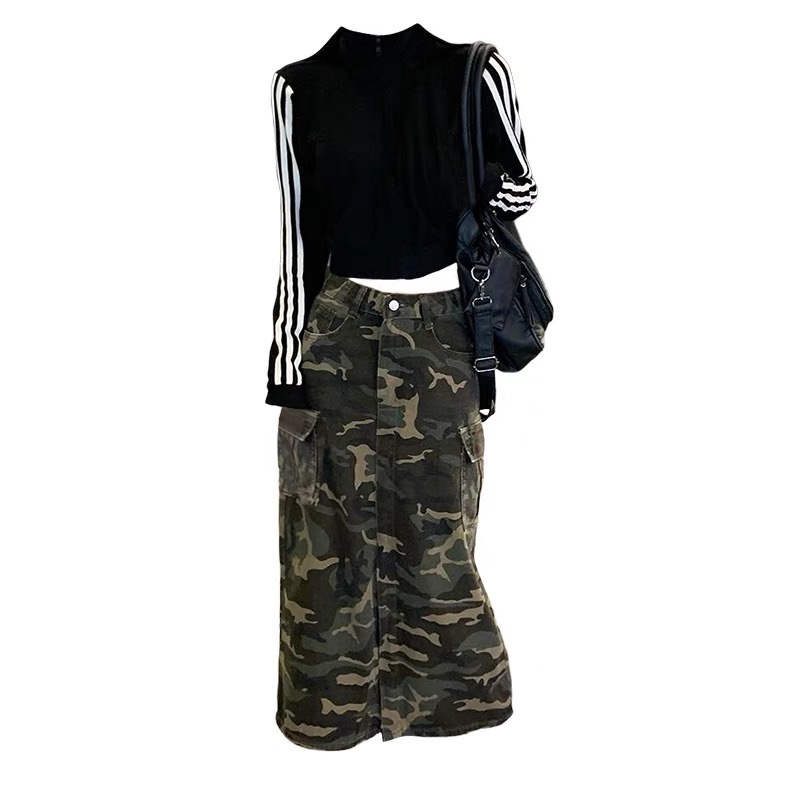 QKOOLE Áo croptop kẻ sọc/ chân váy lửng lưng cao thời trang Hàn Quốc cho nữ
