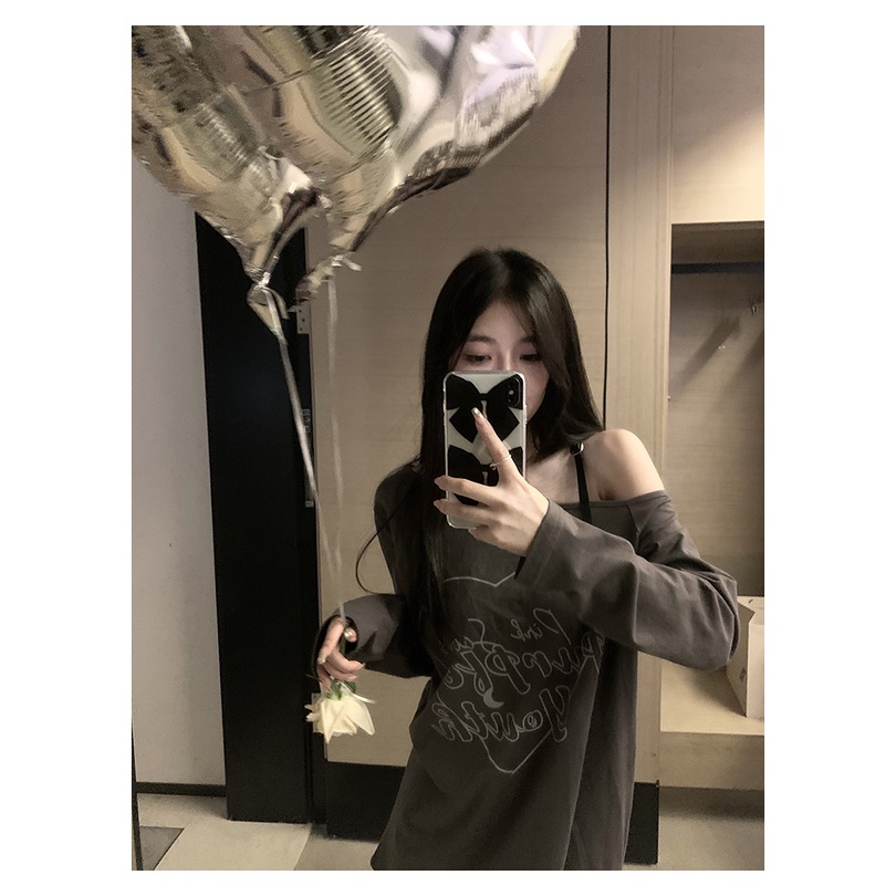 QOEDDV Áo Thun Tay Dài Trễ Vai Kiểu Retro Mỹ Xinh Xắn Cho Nữ