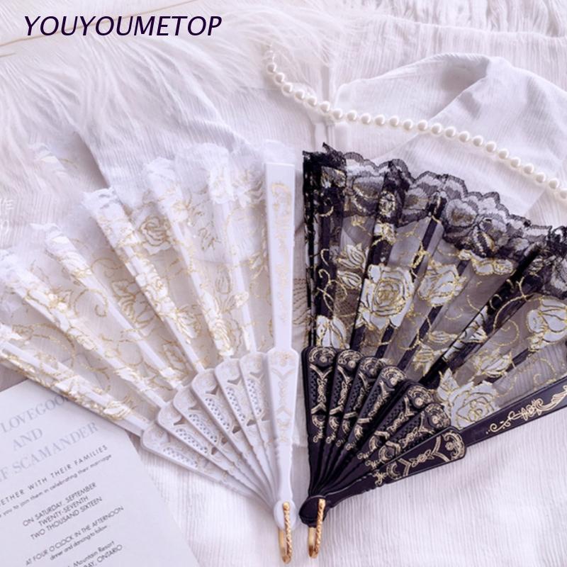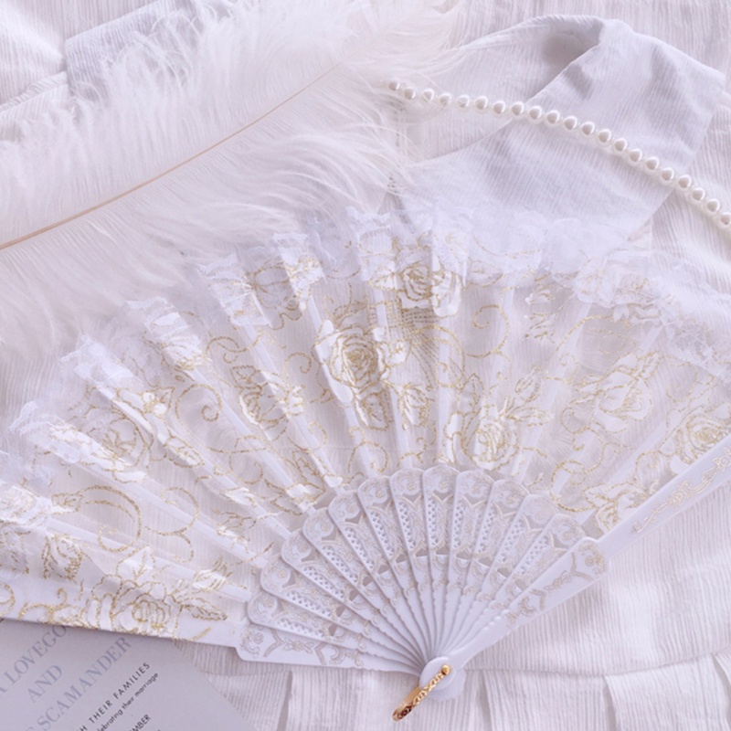 Quạt Xếp Cầm Tay Phối Ren Hoa Hồng Dành Cho Nhảy Múa Tiệc Tùng