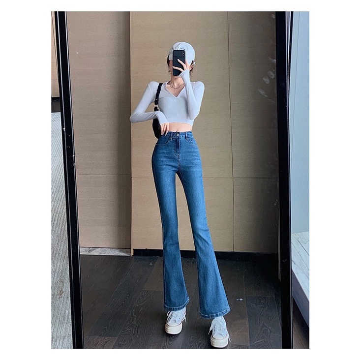 Quần ống loe dáng dài may gấu nữ, quần bò jean cạp cao ống vẩy co dãn màu xanh - đen