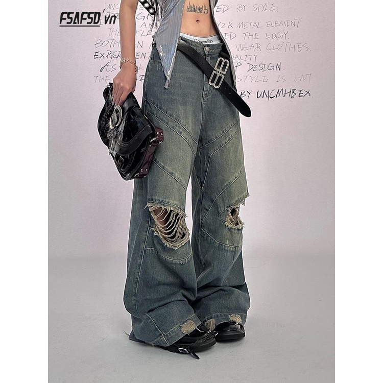 Honypove Hot Girl Thái Lan Quần Denim Ống Rộng Rách Đường Viền Giải Tỏa Căng Thẳng Phong Cách Mỹ Mát