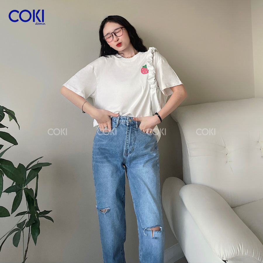 Quần baggy jean nữ mẫu mới lưng cao rách gối phong cách COKI