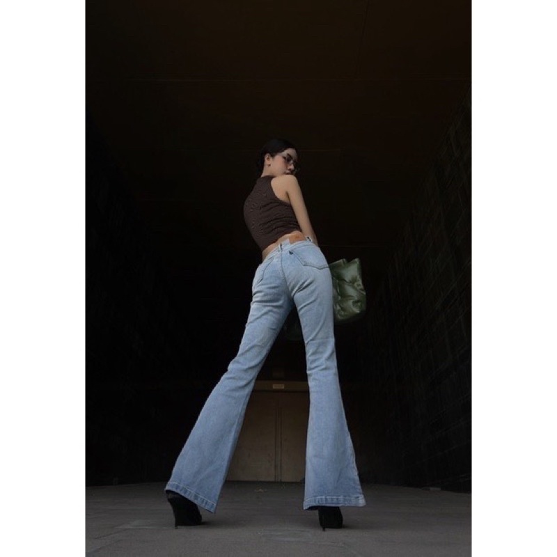 Quần jeans ống loe co giãn gấu tua rua dáng dài lưng cao phong cách Hàn Quốc