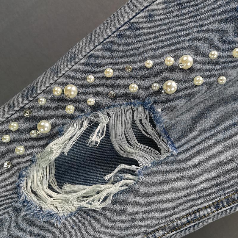 Quần Jean Baggy Lưng Cao Dáng Rộng Phối Rách Đính Hạt Cá Tính Cho Nữ