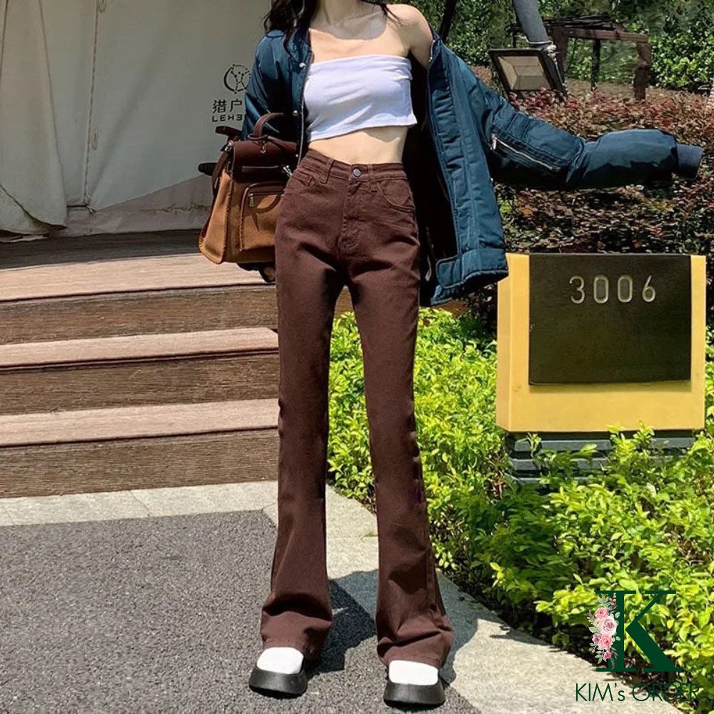 Quần Jean Nữ Ống Loe Màu Nâu Đen Cạp Lưng Cao Phong Cách Retro Ulzzang Hàn Quốc Cá Tính Sành Điệu Chất Loại Đẹp Cao Cấp